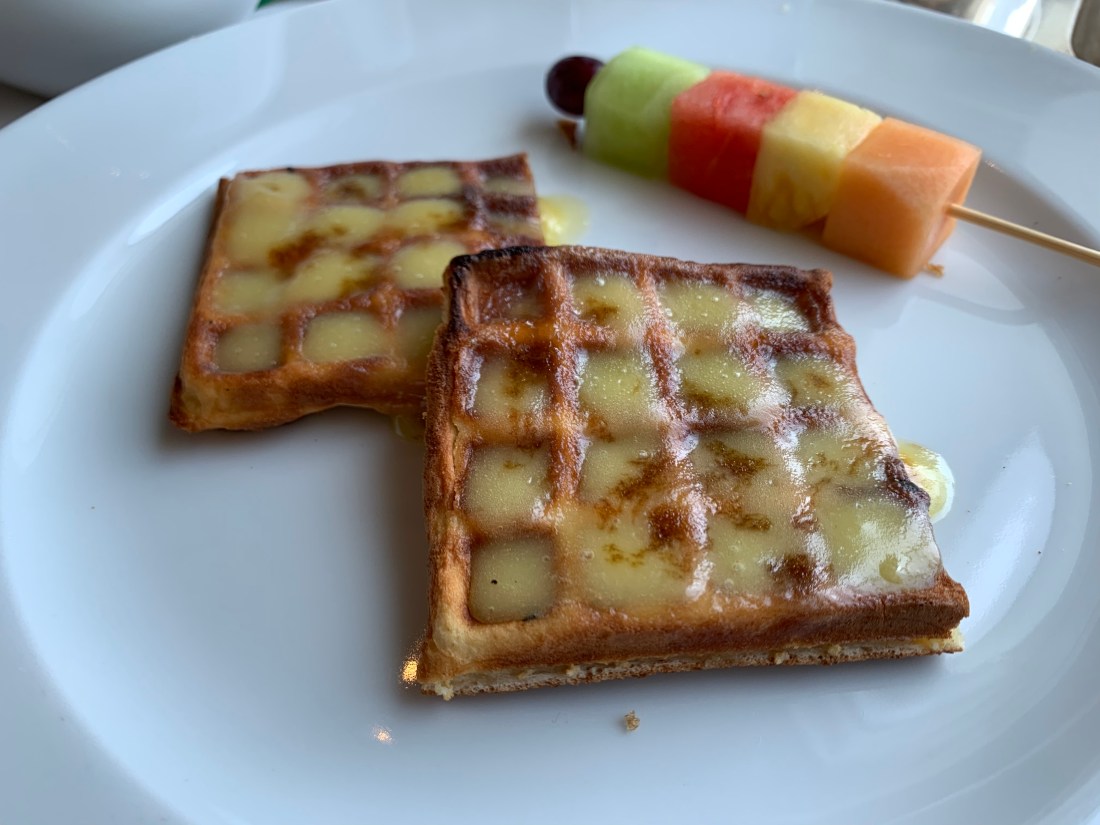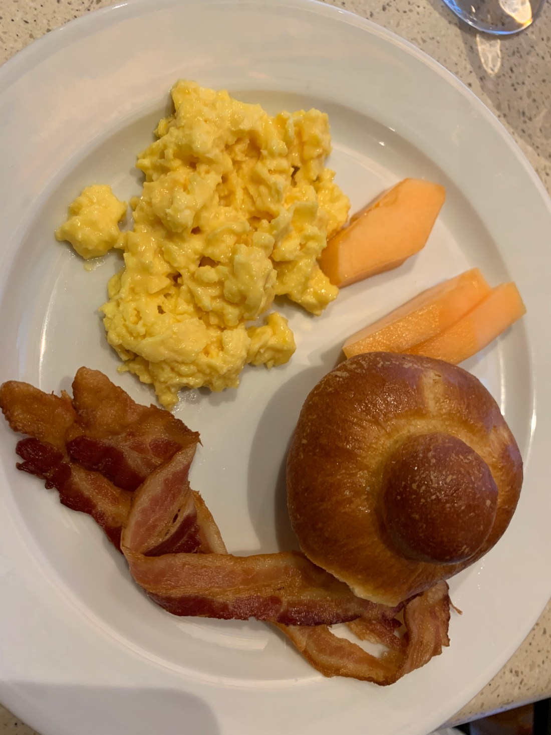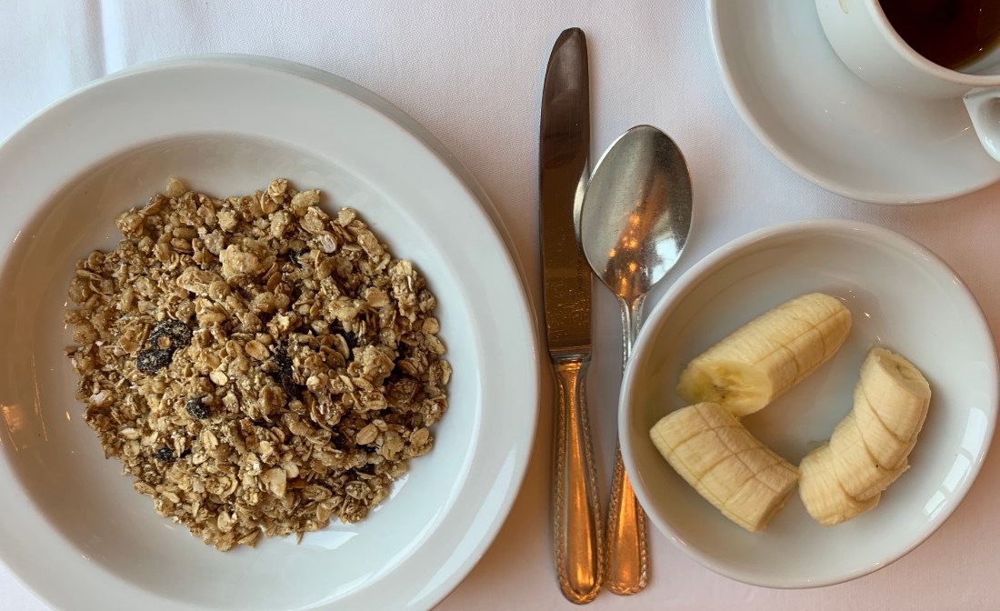 We had breakfast in the Grand Dining Room. Jim had granola with a banana and a brioche. Patricia had watermelon slices and a waffle.