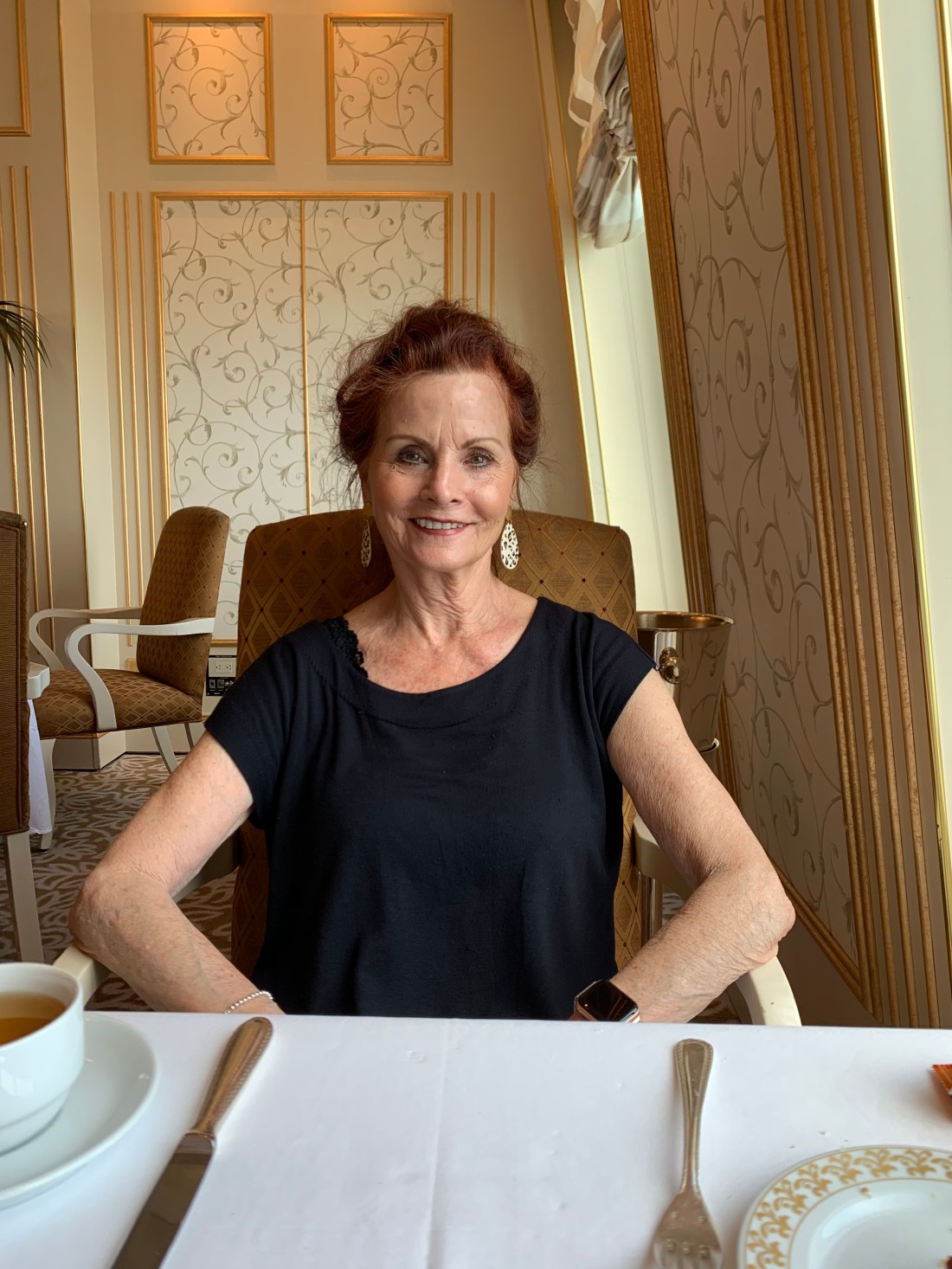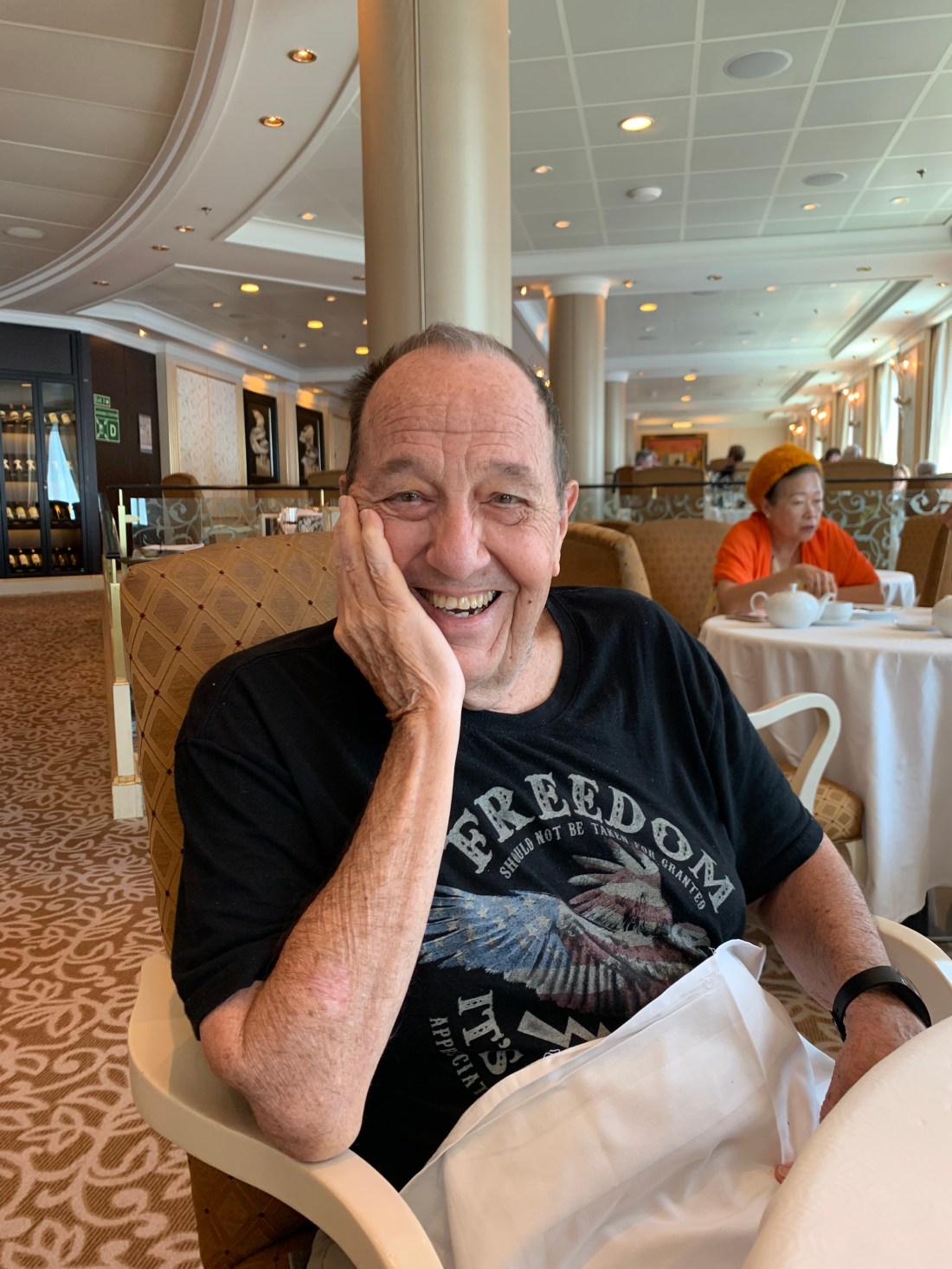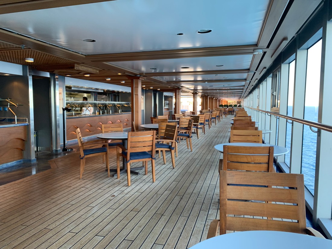 We had breakfast in the Terrace Cafe with our usual breakfast. Jim having cantaloupe, eggs, bacon and brioche and Patricia having muesli with strawberries and blueberries.
