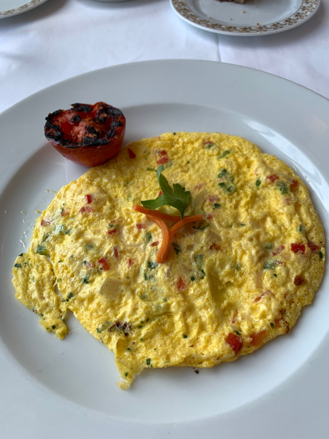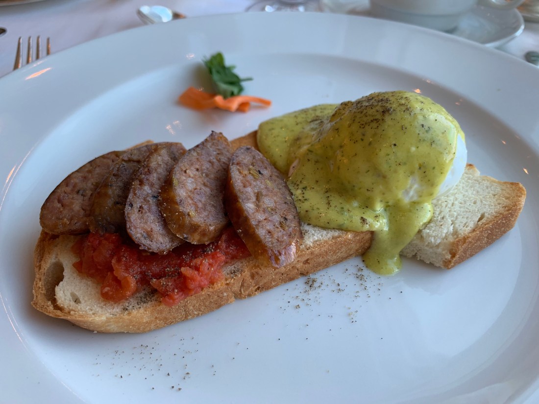We had breakfast in the Grand Dining room this morning. Jim had tomato juice, granola with a banana and a brioche. Patricia had a Tuscan eggs Benedict that had toasted Italian bread with Italian sausage and tomatoes confit.