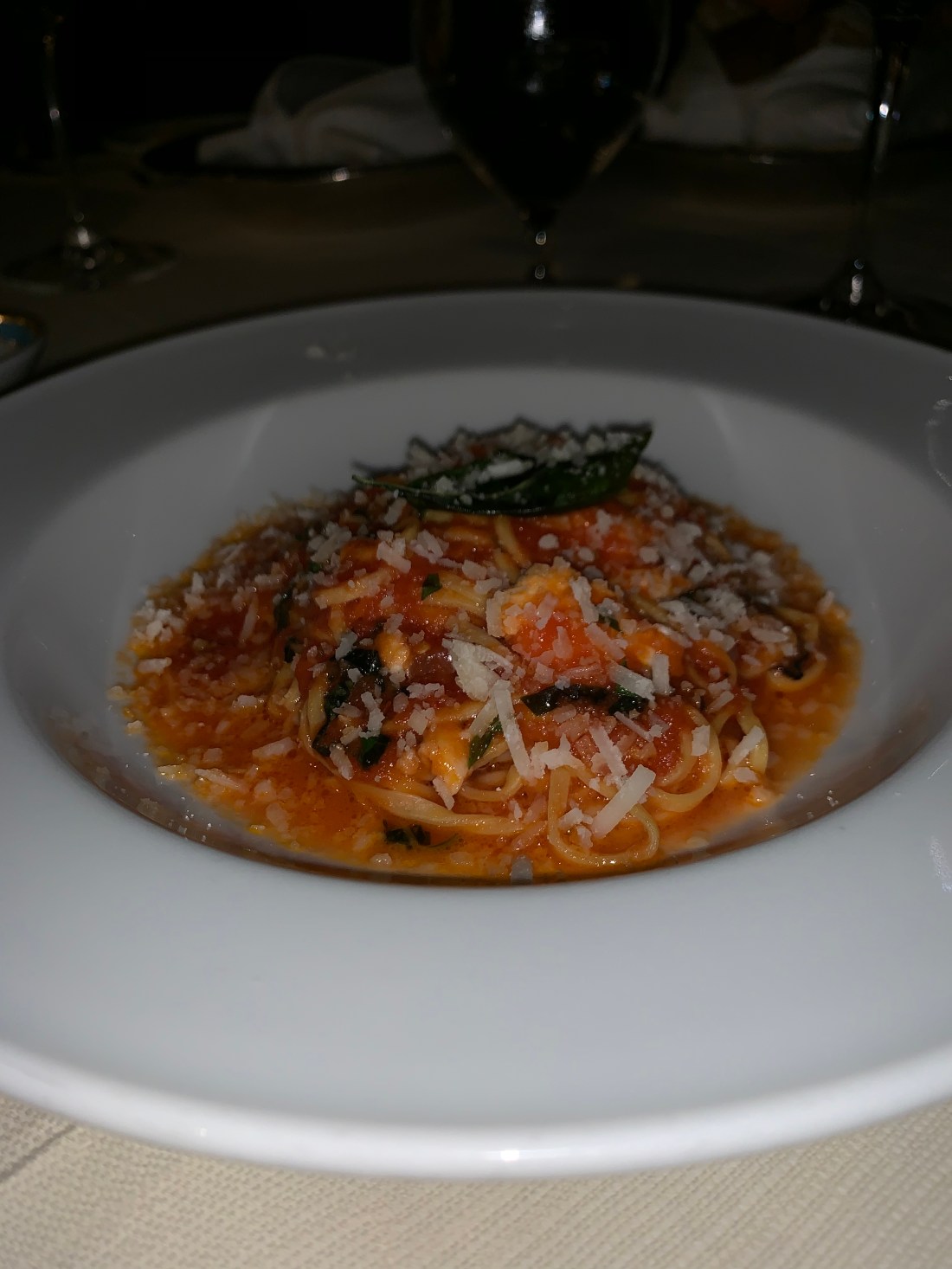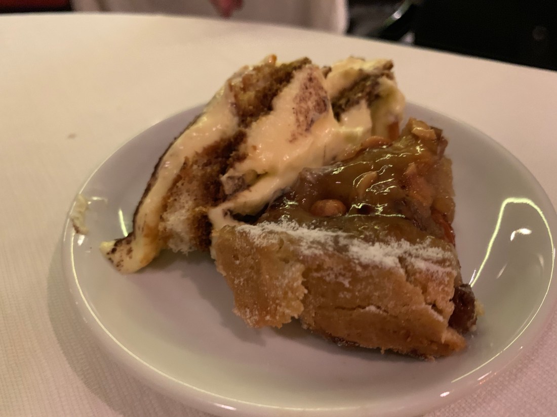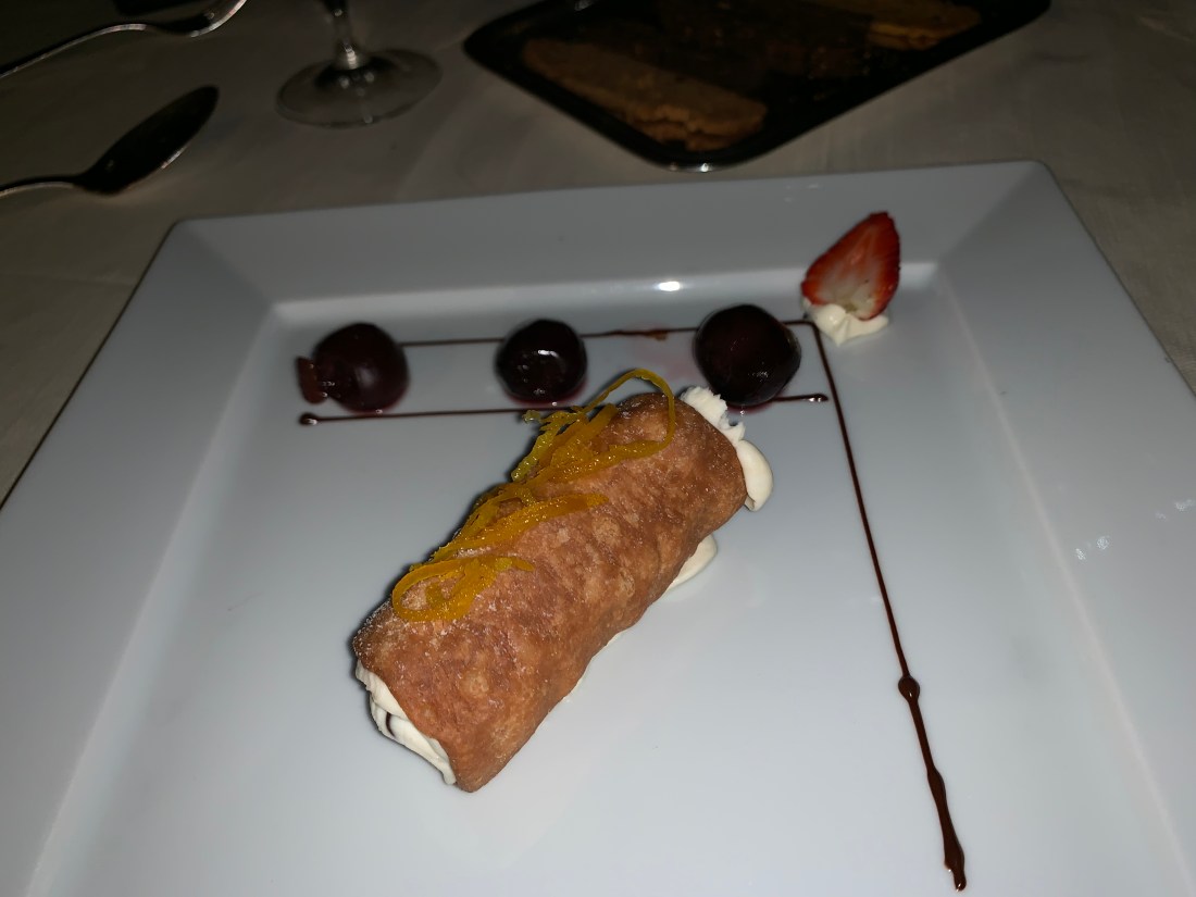 We had dinner at Toscano Restaurant tonight at 6:30 PM. Jim had a caesar salad and a trio of pastas. Patricia had her favorite volcano pasta, Caesar salad, sea bass with lemon and caper sauce and a special angel hair pasta of the day with cherry tomatoes and artichokes. For dessert we shared cannoli and biscotti.