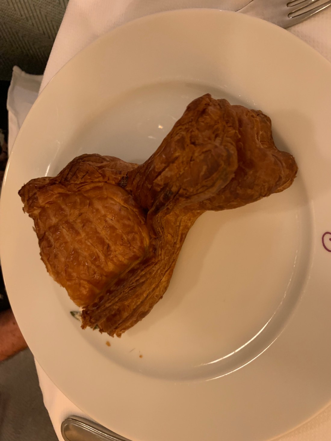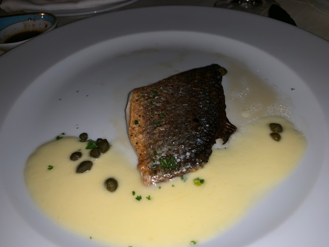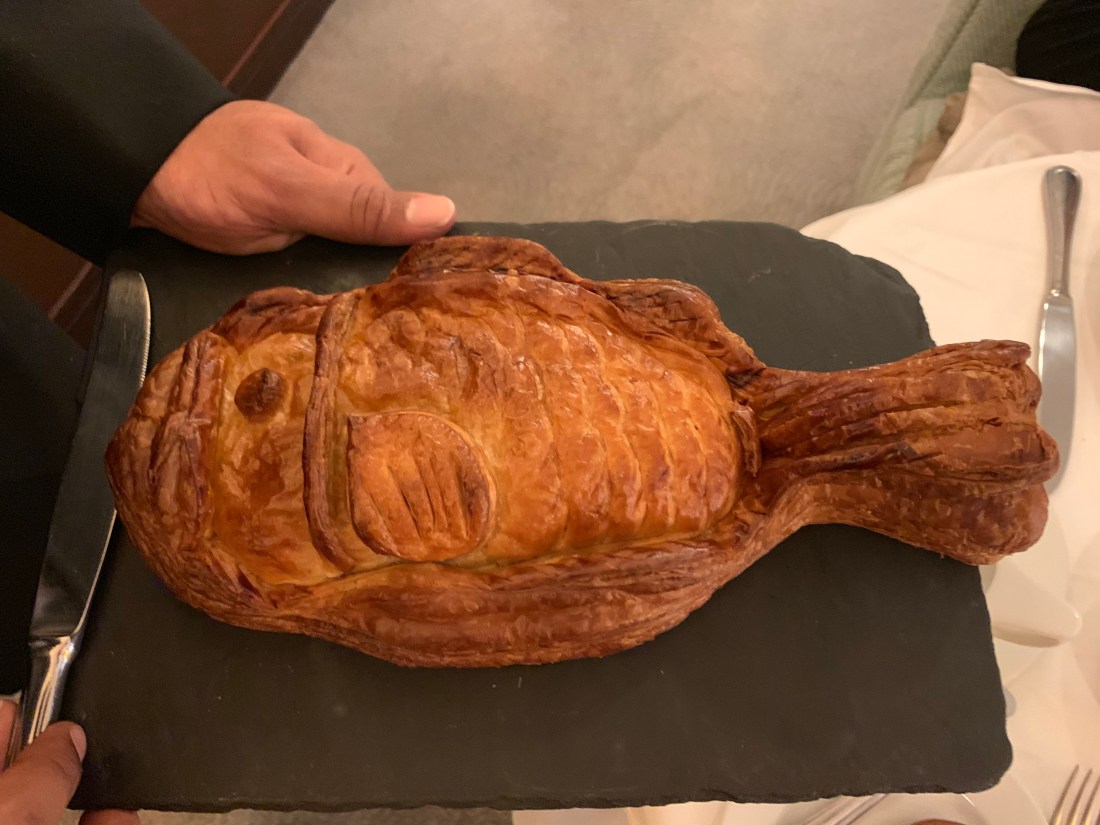 Our main course we shared was the sea bass fillet baked in a puff pastry crust with Beurre blanc sauce that was specifically for two to share. The puff pastry was shaped like a fish.