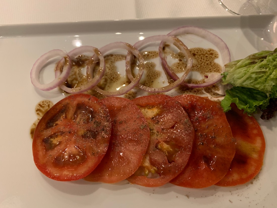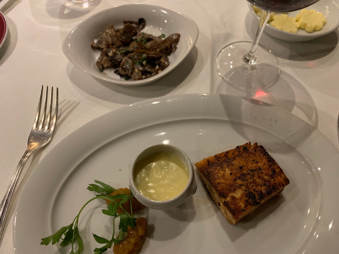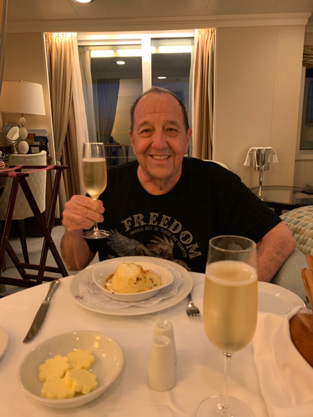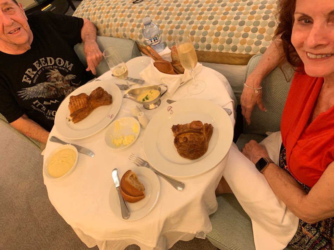 Our evening was the sharing of five items. Throughout the meal we shared a complimentary bottle of champagne in flute glasses. We were so surprised at how much we enjoyed eating a fine meal and dining in our penthouse suite.