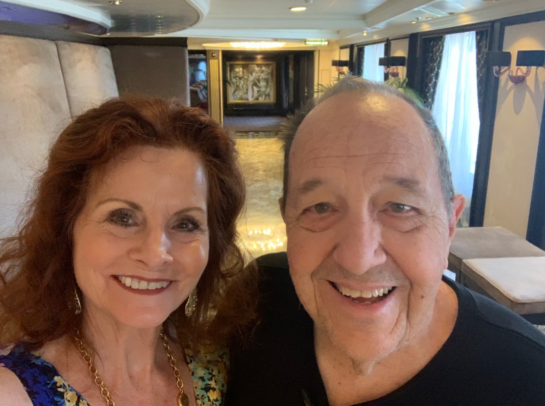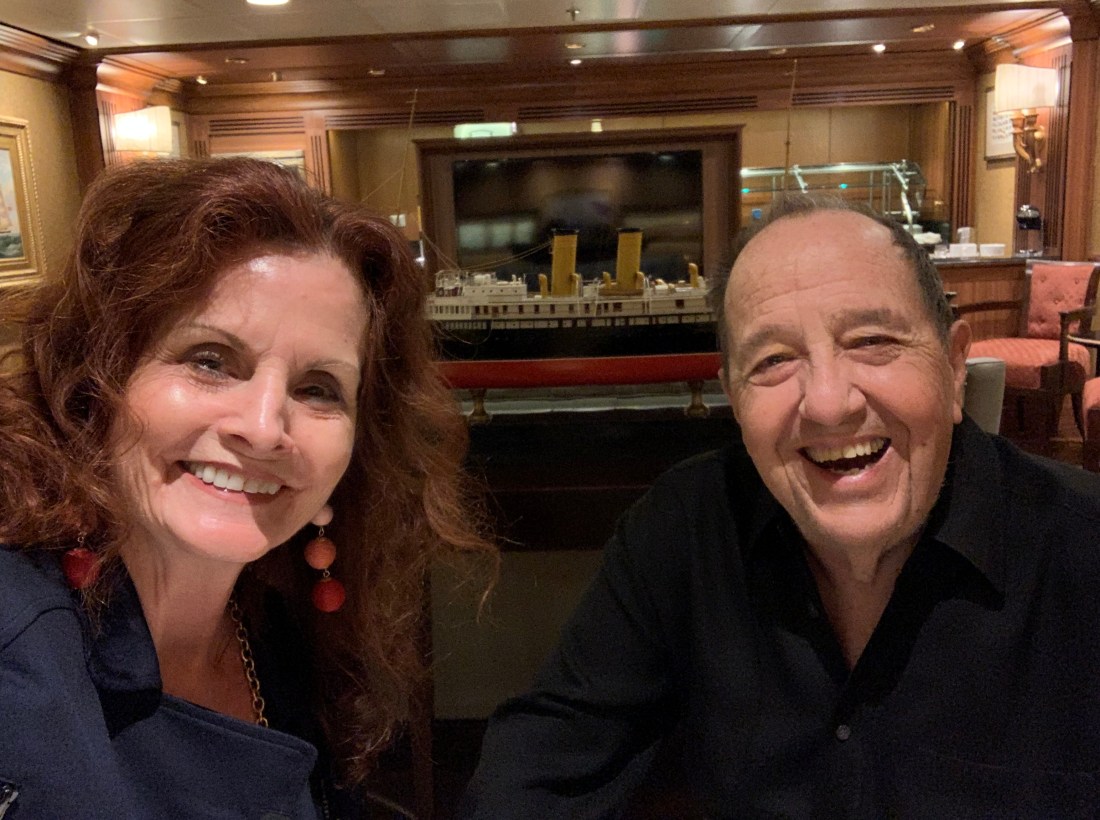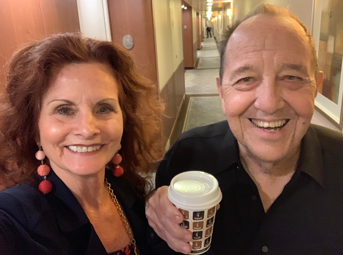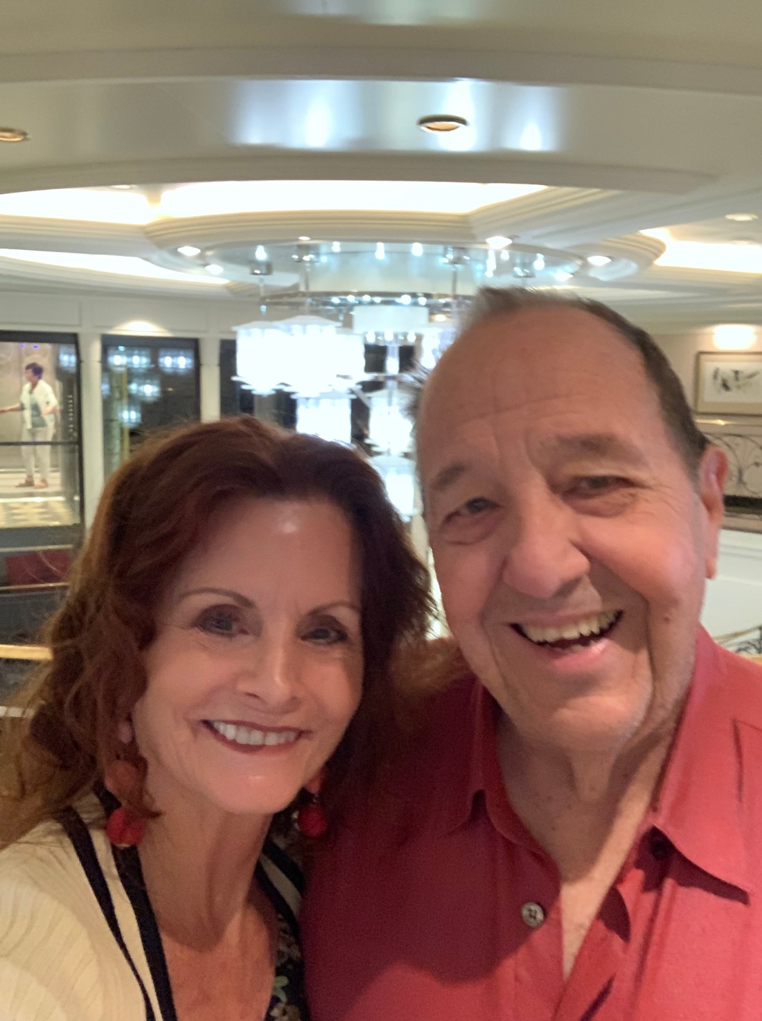 Tonight we had dinner at the Polo Grill which is one of the specialty restaurants that specializes in steaks. Our reservation was at 8:30 PM. Jim had beet salad, 7oz filet with steak fries and onion rings. Patricia had an imitation wedge salad but it was tomatoes, cheddar cheese and bacon bits with lettuce and dressing that tasted like cocktail sauce. She had swordfish with firecracker sauce and mushrooms. For dessert we shared a 7 layer dark chocolate cake and vanilla ice cream. We sat next to a table of 4 and we could hear the conversation and tried to ignore what they were saying by talking between ourselves. We started answering questions that they were asking each other.