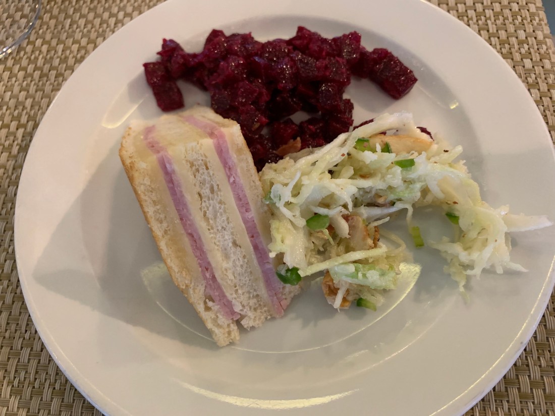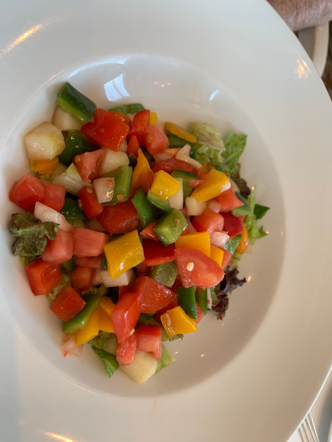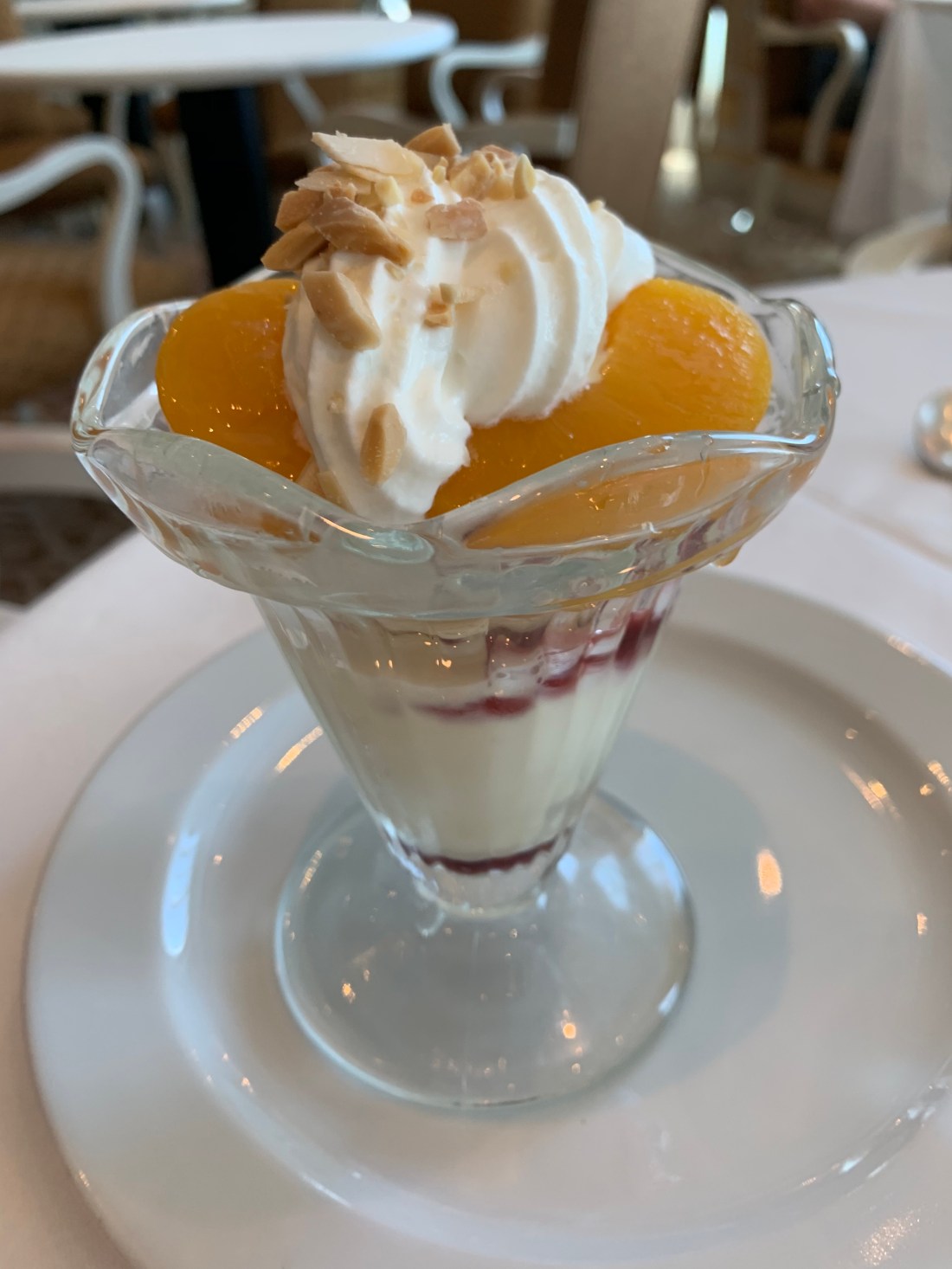 Lunch was at the Grand Dining Room and Jim had vegetable soup, Israeli chopped salad and Patricia had a greek salad. For dessert Jim had peach melba and Patricia had apple ginger cake with vanilla ice cream.