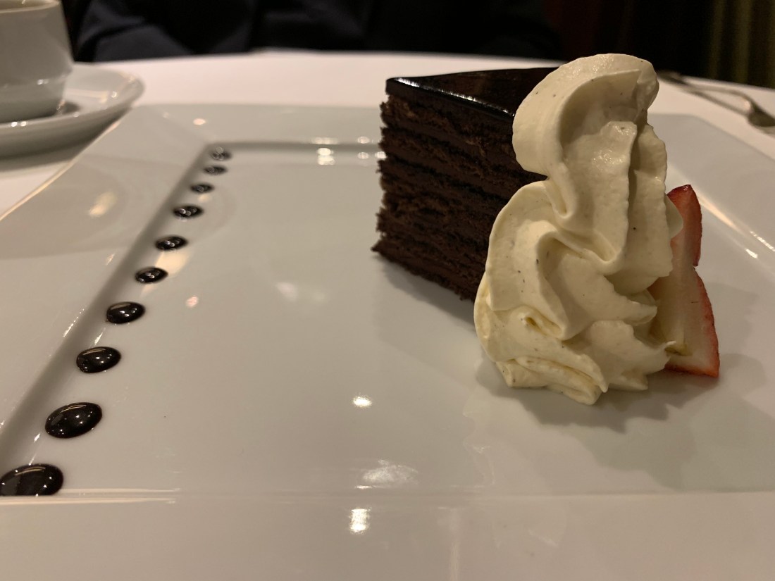 For dinner we had reservations at 7:30 PM at the Polo Grill. Jim had lobster bisque, but he didn’t like the soup, a Waldorf salad, a 7 oz medium filet charred black which he loved and steak fries. Patricia had clam chowder, tomato and onion salad, mushrooms and blackened salmon with sauce. For dessert we shared a seven layer dark chocolate cake.