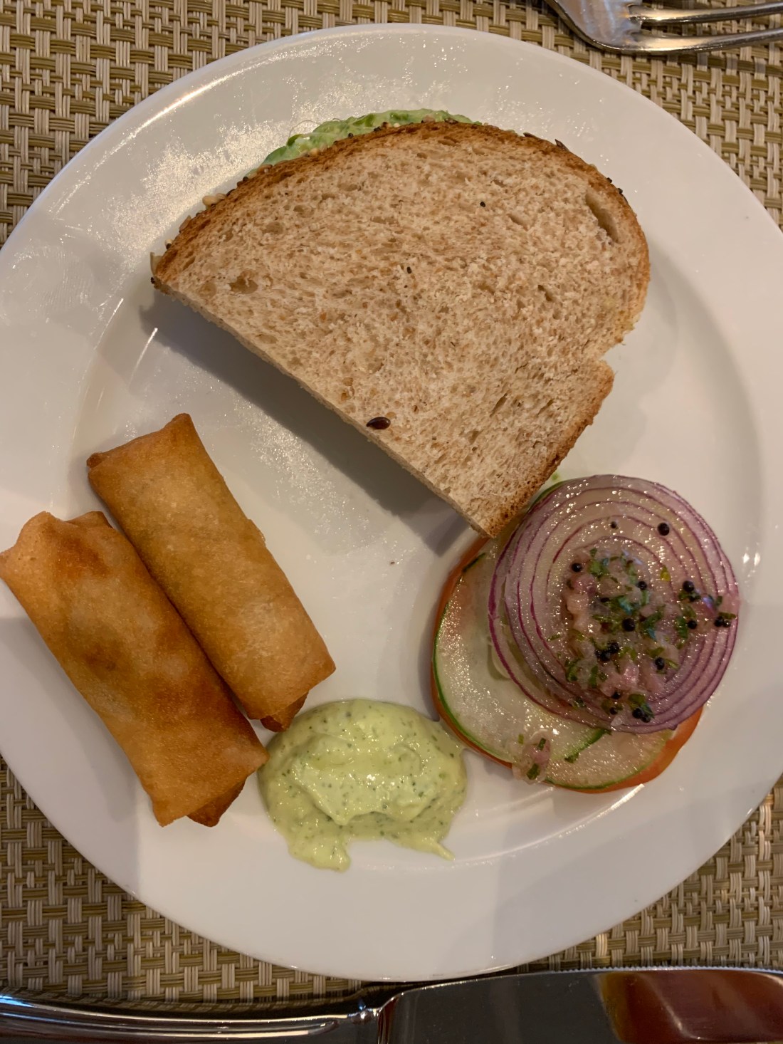 We had lunch at the Terrace Cafe. Jim had margarita pizza with some swedish meatballs. Patricia had vegetable spring rolls, avocado, green peas and egg salad sandwich and a tomato, cucumber and onion stack. For dessert we each had a scoop of ice cream. Jim had mint chocolate chip and Patricia had swiss mocha.