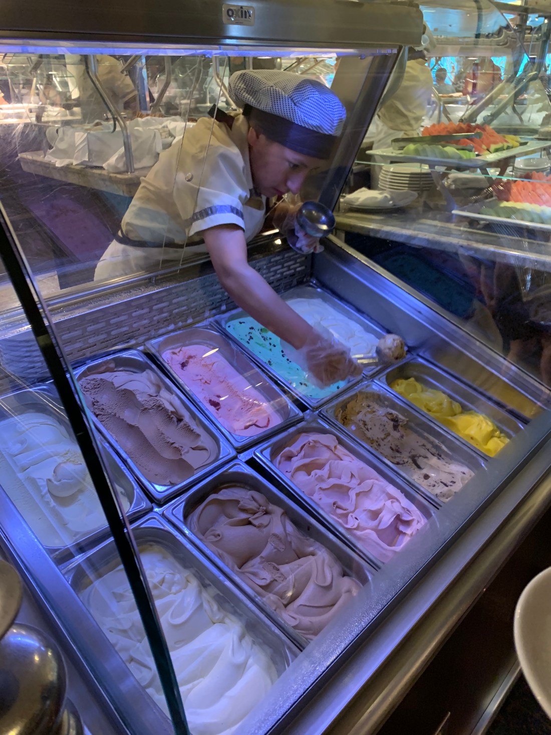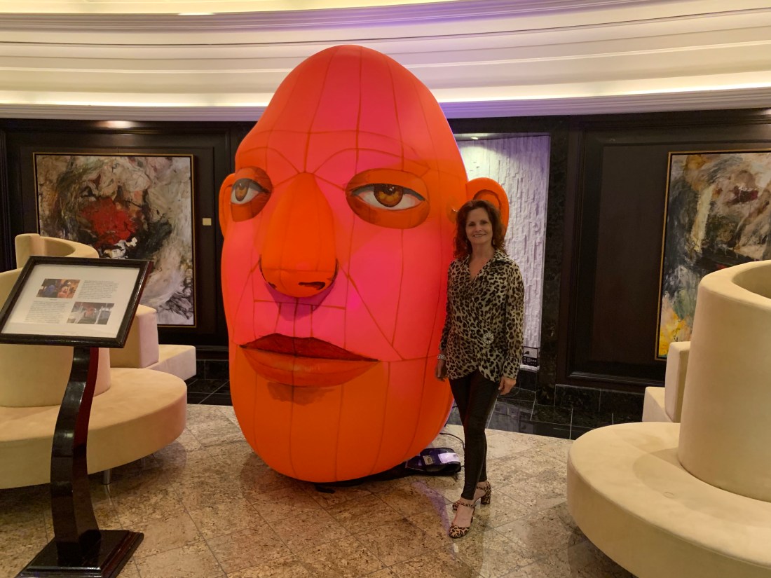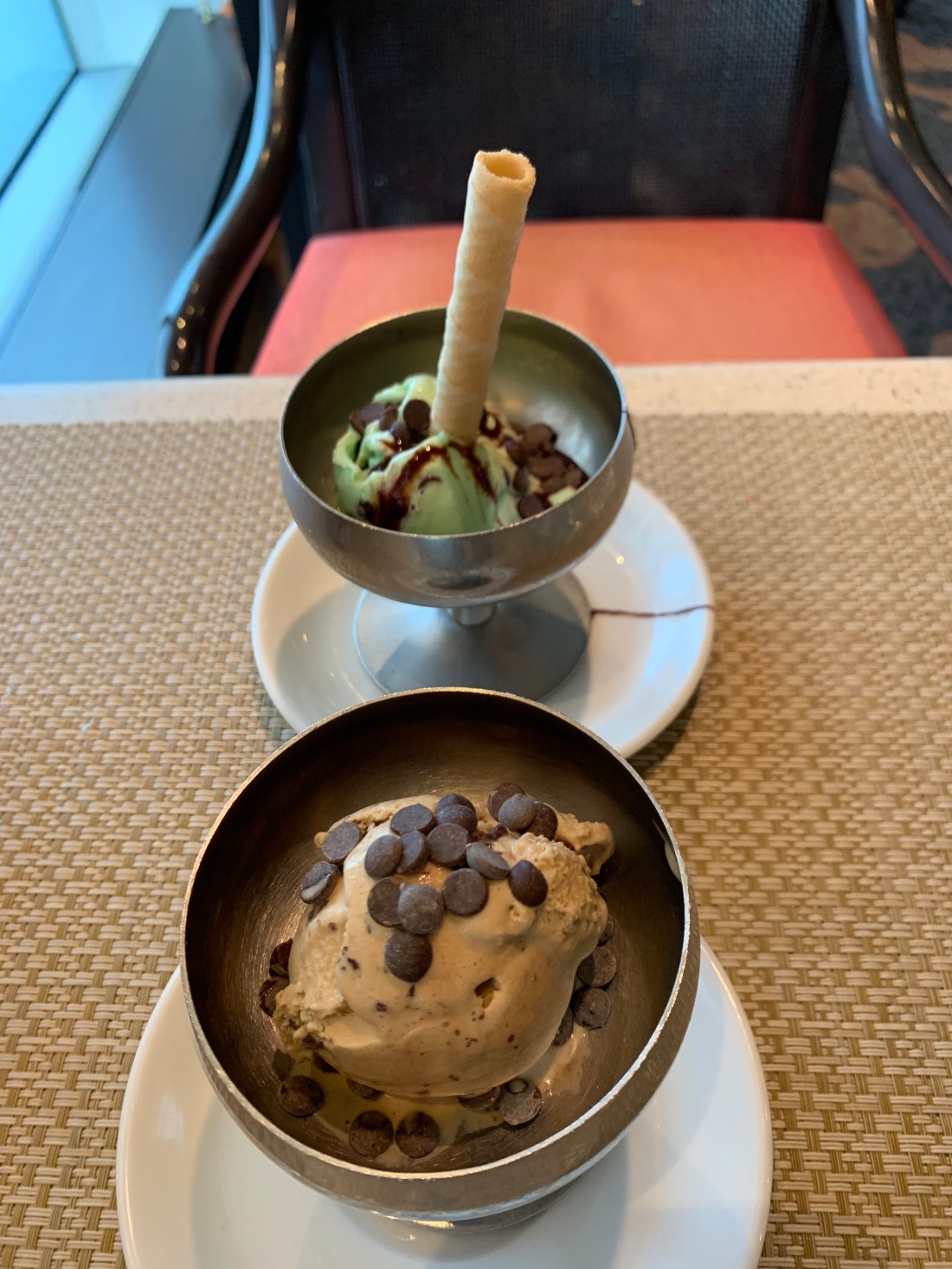 With a nod to feng shui, Red Ginger radiates harmony and tranquility. We had dinner here tonight in this specialty restaurant. The interior has ebony woods, hand blown glass fixtures and striking, modern Asian art. To complement the stunning decor Red Ginger’s chef’s have created contemporary interpretations of Asian classics. We were pleasantly surprised how good the meal was. We were each given a bowl of edamame beans as a complimentary dish from the chef. We were shown a box of chop stix we could choose to use. They were beautiful and some had mother of pearl handles. Jim and Patricia both had caramelized tiger prawns and miso sea bass that had been marinated for 24 hours. Jim had potato rolls and Patricia had avocado lobster salad. For dessert Jim had soft ice cream Japanese togarashi, chili salt and it was fantastic. Patricia had Bounty cake which was a coconut cream cake and reminded her of the Bounty bars she use to get in Germany.