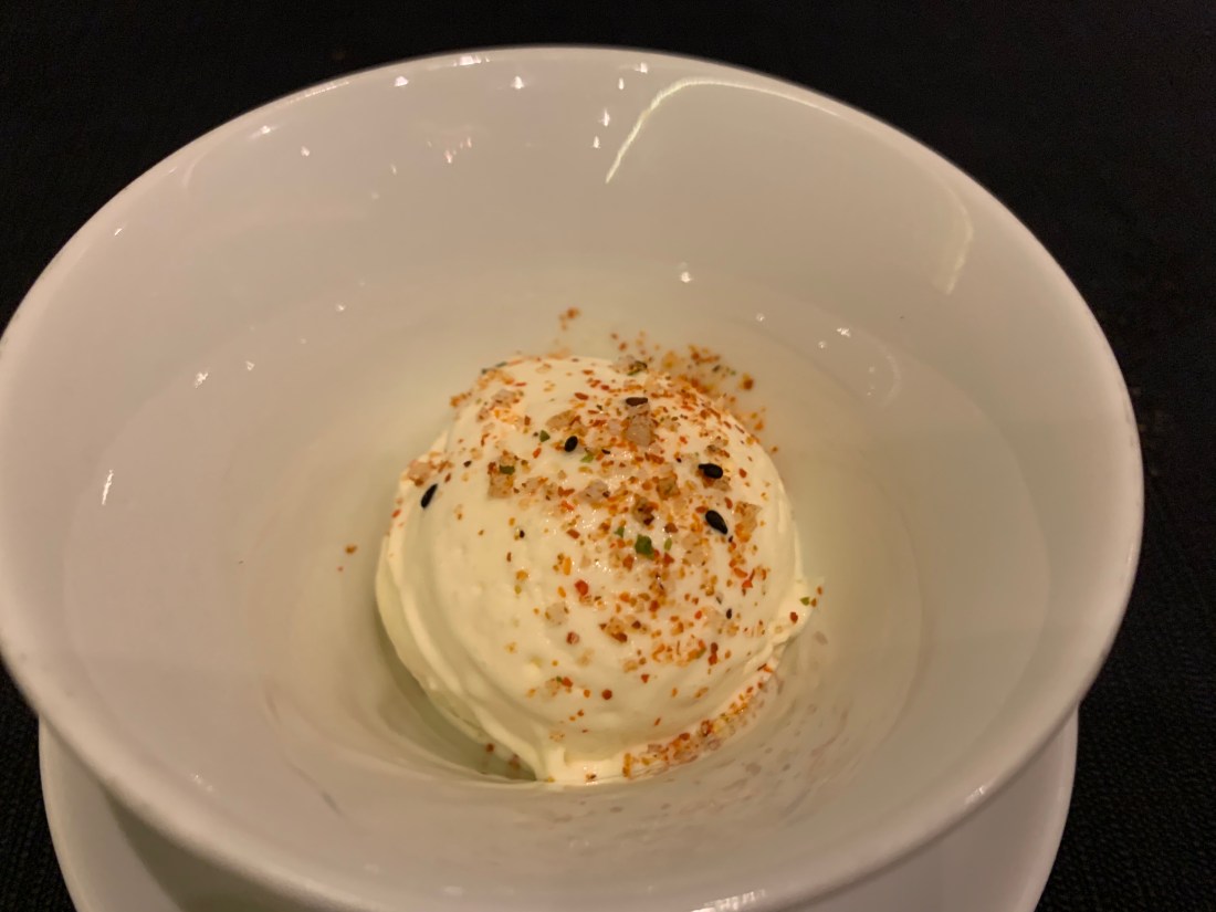 The first course was Molten goat cheese soufflé with heirloom tomato sauce.