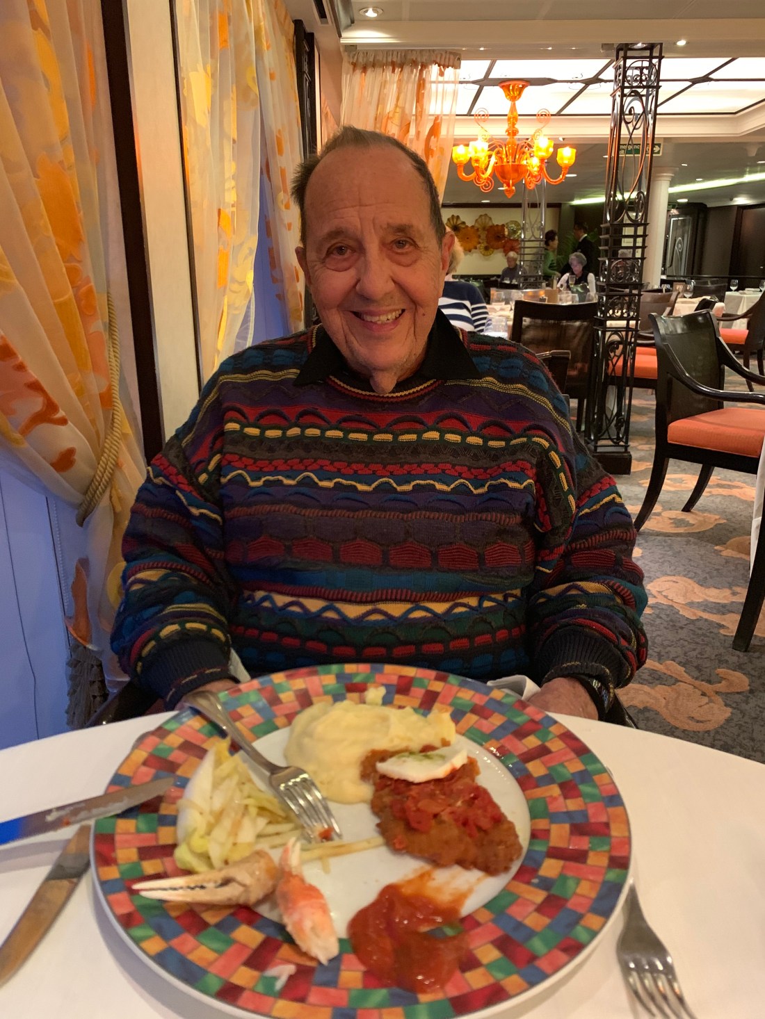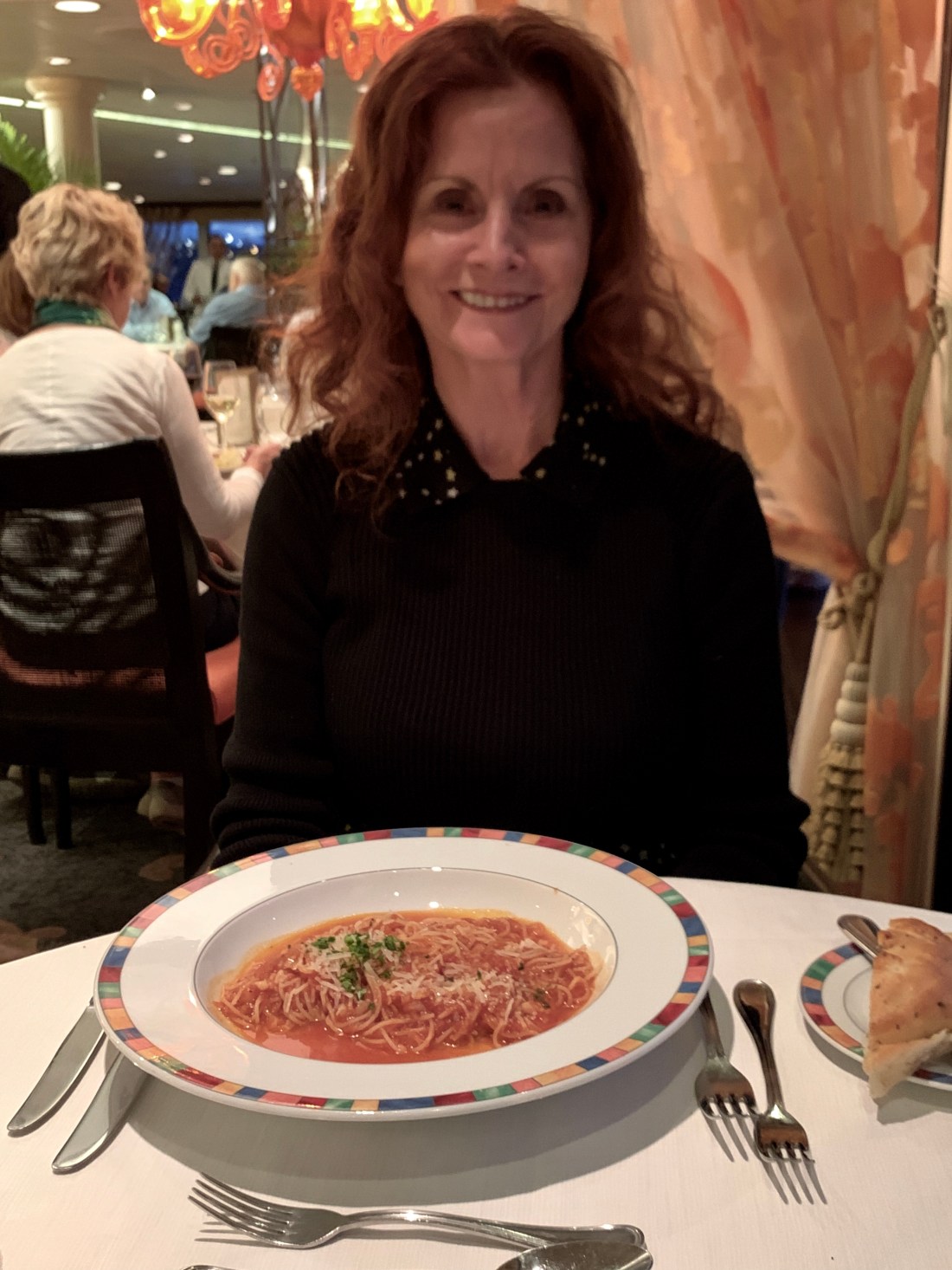 For dinner we ate at the Terrace Cafe. Jim had veal piccata parmesan with pasta, mashed potatoes and crab legs. Patricia had spaghetti with marinara sauce and focaccia bread. For dessert we tried pina colada cream cake and Bounty cake which reminded Patricia of a Bounty bar she would buy in Germany. Jim had a scoop of ice cream.